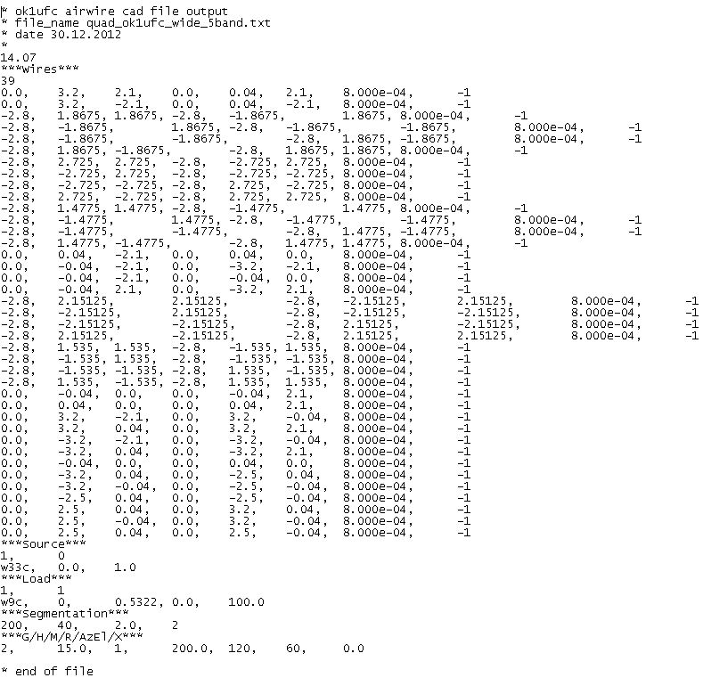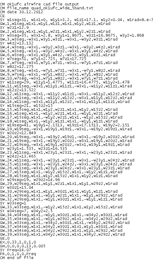Jak jsem psal v úvodním odstavci, geometrický návrh antén dělám ve "strojírenském" CADu. Takový CAD mi umožňuje zejména správu celé řady detailů geometrického modelu. Lze na něm využívat vrstev. Pro mě má výhodu v tom, že jsem si v minulých létech udělal celou řadu tzv. předprocesních utilitek pro NEC enginy MININEC a NEC-2 a také jsem si nakreslil více než tisíc modelů různých antén.  Snadno z tohoto mého kreslítka vyrazím exportovaný soubor pro NEC program bez ohledu na to, zda jde o EZNEC, MMANA-GAL MININEC nebo NEC-2 z programu 4NEC2. Jednoduchý textový soubor s popisem středně složité antény, jako je tento dvouprvkový pětipásmový quad, který odpovídá grafickému schémátku antény, které bychom kreslili ručně ve vestavěném modulu "Geometry edit" programu 4NEC2 vypadá takto: