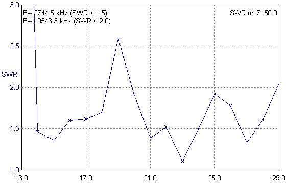 bylo na 19 MHz VSWR=2.6, změřeno bylo VSWR=2.0 až 2.5, podle výšky montáže