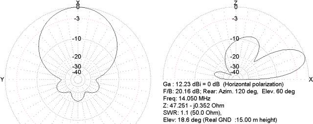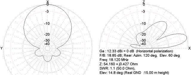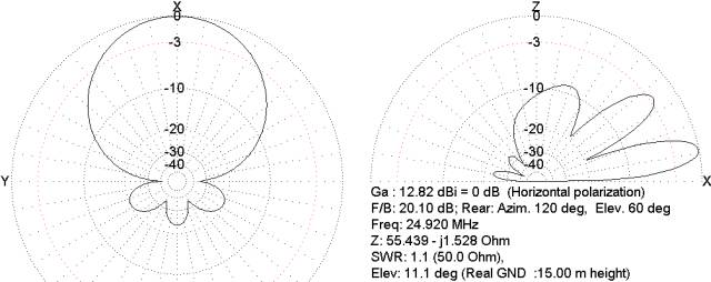 Pozn.: Anténu lze z hlediska zákl. parametrů F/B a G srovnávat s tříprvkovým krátkým monobanderem, navrženým pro Zo=25 Ohm. Viz příklad uvedený v prvním diagramu dokumentu z prázdninových aktivit - zde.