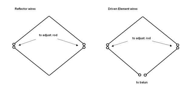 Všimněte si, že obrázek vpravo má proti obrázku vlevo přibližně 10 dB pokles (dip). K6CT ladil anténu na dip pomocí sériového variabilního kondenzátoru v reflektoru. Uvažoval jsem o tomto způsobu, ale nelíbily se mi tyto věci - potřeba robustního kondenzátoru a velký rozměr, který zvyšoval aerodynamický odpor antény. Proto jsem vyvinul tuning rods (adjustment rods, ladicí tyčky), které jsou malé a mají vysoký rozsah ladění. Pokud ladíme kapacitou, má smyčka větší obvod, pokud ladíme tyčkou, má menší obvod.