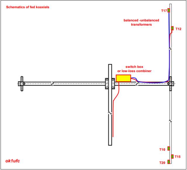 Do ráhna se montují  rozpěry smyček zasunutím. Na dalším obrázku je zasunuta svislá vzpěra zářiče (driven element). Barevně jsou zakresleny nízkoztrátové transformátory, které zabezpečují symetrizaci, koaxiální kabely (namalovány jen WARC) a skříňka přepínače nebo tzv. combineru (má horší parametry než switch), který umožňuje paralelní spojování smyček. Původní funkční vzorek byl osazen levnými baluny série 2, ale jsou ověřovány pro tento účel vyvinuté speciální nízkoztrátové transformátory. Takové řešení má o něco lepší parametry než tzv. gamma-match, ale hlavně jsem získal desetiny dB díky lepší symetrii než u gamma-matche nebo balunů a na pásmu 28 MHz bylo možno dokompenzovat o něco vyšší rezistanci smyčky (typicky 58, maximálně 60 Ohmů). U této antény si opravdu hraju s kompenzací ztrát odrazem.