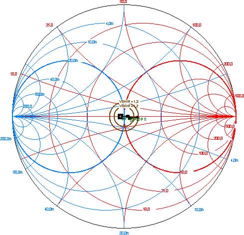 Typické hodnoty impedancí na svorkách antény pro jmenovitý kmitočet v každém pásmu je vidět ve Smith. diagramu zde:
