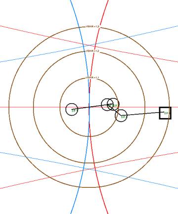 Detail středu kruhového diagramu se zakreslením kružnic VSWR je vpravo (největší kružnice je pro VSWR=1.3 a druhá největší je pro VSWR=1.2)