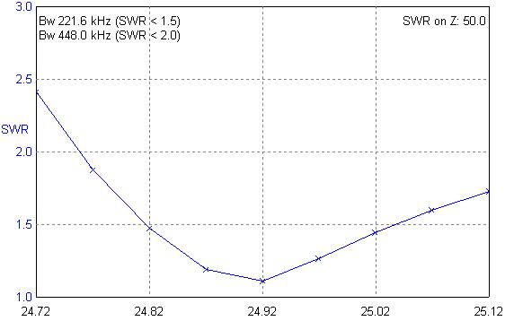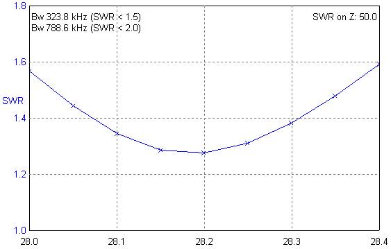 Průběhy VSWR podle kmitočtu a šířky pásma jsou zřejmé z dalších diagramů (platí pro nastavení na kmitočty 14 050, 18 120, 21 050, 24 920 a 28 200 kHz), anténu lze jednoduše ladit kamkoliv v každém pásmu: