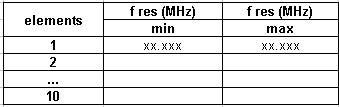 1. Provedení kontroly všech deseti smyček (všechny R a DE). Kontrola se provádí tak, že na měřenou smyčku se nasadí dodaná sonda, která se připojí k anténnímu analyzátoru. Musí být namontované všechny smyčky. Pokud se používá balun (série 2), jsou smyčky zkratované dodanými jumpery. Pokud se používá symetrizační trafo, nesmí být připojen koaxiální kabel. Analyzátorem musí být změřen rezonanční kmitočet, který je uveden ke každé anténě v tabulce, podobné, jako na tomto obrázku. Rezonanční kmitočty musí ležet v tolerančním poli mezi f min a f max: