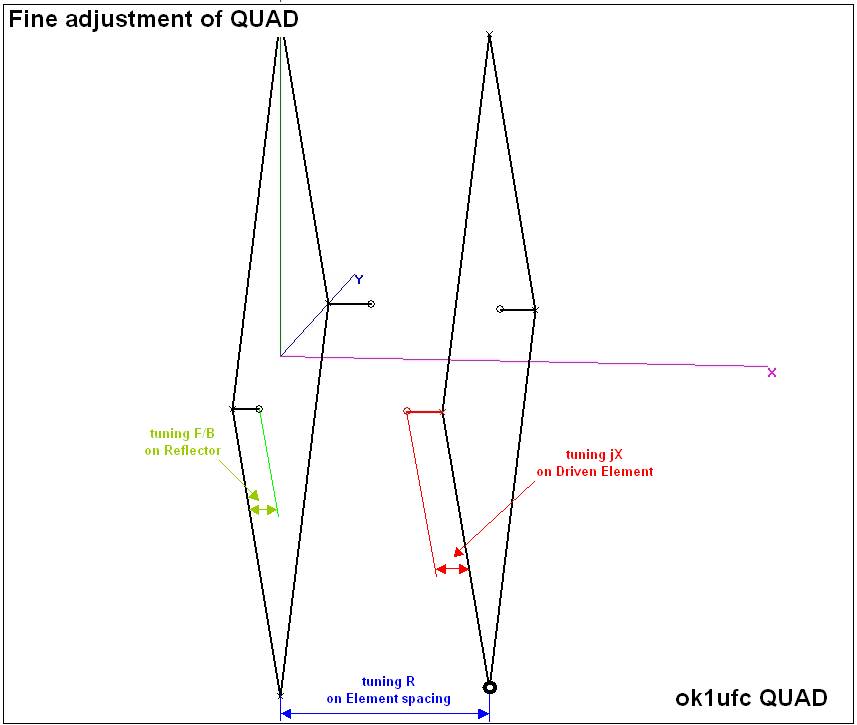 Anténa je konstruována s ohledem na dosažení co nejlepších F/B a VSWR parametrů. Toho lze u QUADů (na rozdíl od krátkých yagi) dosáhnout. Musely být minimalizovány nejrůznější ztráty. Vliv mají: reaktance v sérii se smyčkami, překvapilo mě, jaký vliv má prodloužení smyčky žebříčkem.