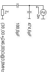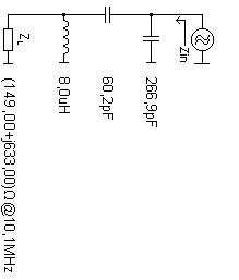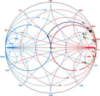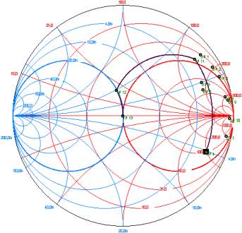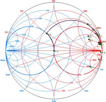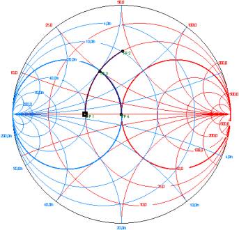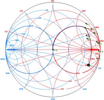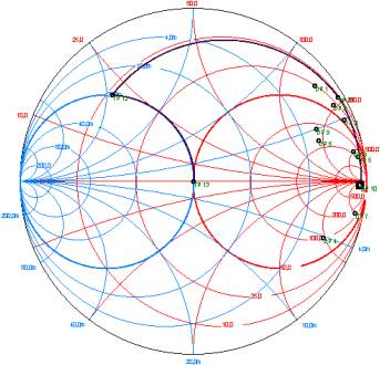 Z obrázků vidíte, že body (impedance) nad červenou kružnicí se ladí jen dvěma kondenzátory. Impedance uvnitř červené kružnice se ladí paralelním obvodem s děličem. Paralelní indukčností se "vyjede" těsně nad a potom se ladí kondenzátory. Ještě uvedu ladění nízkých impedancí: