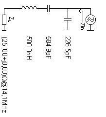 Uvnitř modrého kruhu je bod s impedancí (25+j0). Ladí se indukčností v sérii s anténou. Indukčnost 500 nH "vyjede" nad modrou kružnici. Kondenzátor v sérii 585 pF "vrátí" bod přesně na modrou kružnici. Kondenzátorem 226 pF naladíme do středu diagramu (VSWR=1). Problém ladění nízkých impedancí je vidět zde: