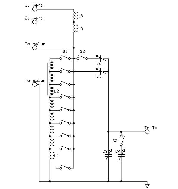 Funkci popíšu podrobněji. Napájecí žebříček od drátových antén připojujeme na svorky "to balun" přes balun 1:1(např. Maxwellův typ). Přepínačem S1 připojujeme paralelně indukčnosti L1, případně L2 (3 indukčnosti na toroidech). Přepínač S1 má nevyužité polohy.Ty jsou důležité, pro některé typy ladění potřebujeme odpojit indukčnost úplně. Kondenzátor C1 a C2 má společné ovládání a veliké mezery. C1 má maximální kapacitu 250 pF a C2 asi 400 pF. Spínačem S2 je lze připojit paralelně. Kondenzátor C3 a C4 má rovněž společné ovládání. C3 má maximální kapacitu asi 510 pF. C4 jsou 3 kondenzátory spojené paralelně a mají maximální kapacitu asi 1 525 pF. Spínačem S3 se spojují paralelně všechny 4 sekce, když je to třeba. Pro připojení antén s nízkou impedanci jsem ještě realizoval indukčnosti L3 a připojil je na samostatné konektory. Indukčnosti L1: válcová, průměr D=30 mm, průměr drátu = 3 mm, délka něco přes 60 mm; odbočky jsou voleny tak, aby indukčnosti (od zemnící svorky) byly 0.25 mikroH, 0.5 mikroH, 1 mikroH a 2 mikroH. Poloha odpoček byla přibližně: 2.7 záv., 4.5 záv., 7.5 záv. a 13 závitů (konec L1). L2: Cívky L2 jsou již vinuté na feritových toroidech s nízkou permeabilitou a mají indukčnosti (od země): 2 mikroH, 4 mikroH a 4 mikroH. Pomocí cívek lze realizovat indukčnost maximálně 12 mikroHenry, když jsou všechny v sérii. L3: jsou stejné velikosti jako L1 a mají indukčnosti 0.25 mikroH. Jak to ladí? S tímto jednoduchým tunerem jsem spolehlivě vyladil antény G5RV, PA0FRI, Double Zeppeliny i Delta loopy. Příklady ladění ve Smith.diagramech a schémata ladění s hodnotami uvádím dále s důležitými poznámkami.