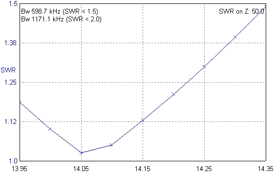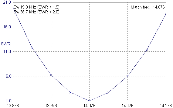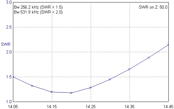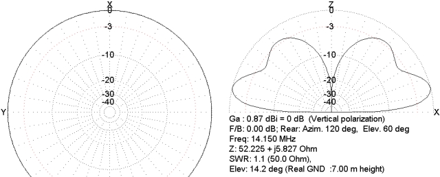 Vyzařovací diagram a průběh SWR u vertikálního dipólu OCF délky 5,2 metru, s kapacitními klobouky na koncích a zkracovací indukčností. Všimněte si hezkého vyzařovacího diagramu a průběhu SWR navrženému právě pro pokrytí pásma 20m. Inu, profesionální práce firmy Hy-Gain na anténě pro všeobecné použití, tj. s použitelnou šířkou pásma přes celé pásmo 20 m.