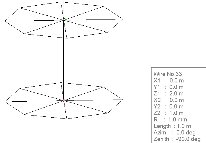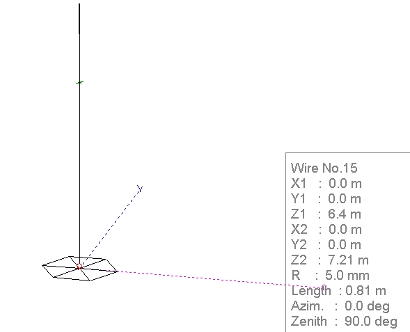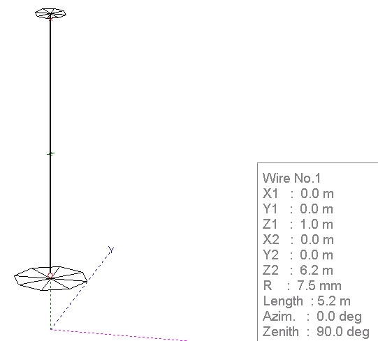 Velice zkrácený vertikál se zátěží kapacitními klobouky. Zářič je tvořen nízkoztrátovou vinutou indukčností z měděné trubky. Výška pouze 1m (tj. 0.05 lambda). Ztráty přizpůsobením "match loss" byly již tak vysoké, že jsem tuto anténu vyřadil z tabulky srovnání. Byla se ziskem - 6 až - 8 dBi pro DX opravdu nepoužitelná.