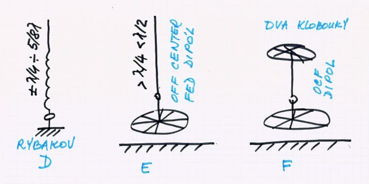 tabulka č. 1 Z tabulky je vidět, že vertikální dipól je sice dlouhý, má ale velkou šířku pásma a slušný zisk. Vertikály mají poloviční délku, protože se nám jejich druhá polovina "zrcadlí" v zemi. Zem může být různě vodivá. V mém QTH mám odpor uzemnění asi 15 Ohmů a vertikály bez radiálů mají proti těm se zakopanými radiály asi o 2 - 3 dB horší zisk. Z tabulky je rovněž vidět, že pro pásmo 14 MHz je zcela zbytečné pracovat s šířkou pásma (pro SWR max. 2) kolem 1,6 MHz. Pokud vertikální dipól zkrátíme jedním až 2 kapacitními klobouky (případ E a F), zmenší se nám šířka pásma, ale se ziskem a diagramem je to OK. Všimněte si, že anténa F je dlouhá jen 5.2 metru, tj. jako čtvrtvlnný vertikál a má ve výšce 7 m asi o 1 dB vyšší zisk Gi. Výrobci toto samozřejmě vědí - pro experiment jsem použil anténu Hy-Gain pro 14 MHz, u této antény jsem velice ocenil profesionální přístup výrobce a vynikající návrh. Panečku, to je marketing, nikoliv obelhávání. Další zkracování zářiče nízkoztrátovou indukčností, ale při zachování kapacitních zátěží (obě měly průměr 1400 mm) již vede ke snižování vyzařovacího odporu na hodnoty srovnatelné s vodivostí materiálů antény. Účinnost se mi již obtížně stanovovala, protože významné byly ztráty přizpůsobením, tzv. "match loss". Ve výsledku byla již tato výrazně horší. Zisk Ga měl být -1.94 dBi, ale skutečnost byla jiná, Ga byl -8 dBi a při jiném srovnávacím měření i -10 dB. Proto tato anténa již není v tabulce, nepodařilo se mi realizovat jednoduše takový přizpůsobovací obvod, abych mohl model antény srovnat se skutečností a tu, co jsem měl, tak ta již nebyla použitelná pro seriózní DX! Chystám ještě článek o CFA anténách. V tomto článku chci vyjít z konstrukce a parametrů Hi-Gain vertikálu o délce cca 1/4 vlny a srovnat ho s anténami CFA, Isotron a EH, které by měly pracovat na jiném principu, magnetické pole by nemělo být buzeno průtokem proudu skrz vodič a měla by padnout hypotéza, kterou jsem uvedl v úvodu tohoto článku. Protože na tento článek bylo mnoho vašich reakcí, uvedl jsem popis srovnávacího měření vertikálů a EH antény zde. Schémata porovnávaných antén