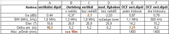 Porovnávané antény K porovnání jsem si vybral správně navržené antény pro pásmo 14 MHz. Konkrétně 10,2 m dlouhý vertikální dipól (střed ve výšce 7m), čtvrtvlnné vertikály montované na zemi, vertikál Modifikovaný Rybakov, dipól napájený mimo střed (s kapacitní zátěží dole) a dipól napájený mimo střed s kapacitní zátěží na obou koncích. Antény jsou v násl. tabulce č. 1 označeny jako A, B, C až F. V téže tabulce jsou shrnuty podstatné výsledky, tj. zisk, šířka pásma BW a elevační úhel.