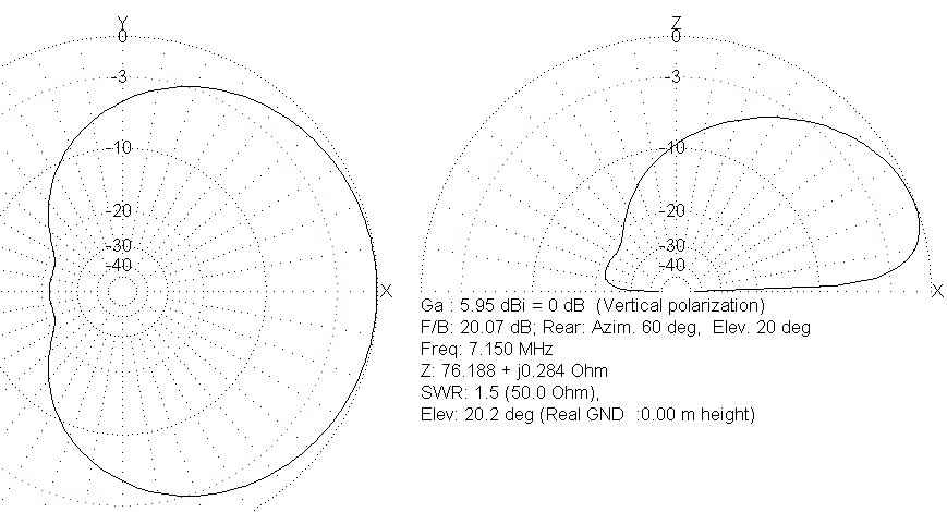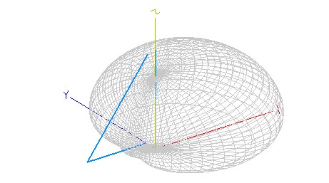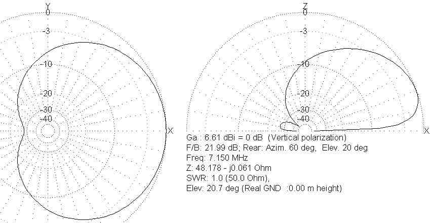 V požadovaném směru je zisk cca 6 dBi, vyzařovací úhel je široký (pro pokles 3 dB minimálně 135°) a zezadu je vyzařování potlačené o 20 dB. Vyzařovací diagram nemá nepříjemná minima, protože při této délce zářiče prostě nemá vyšší laloky. Ano, je to parádička, zejména, když si uvědomíme, zda jsme takového vyzařování vůbec schopni docílit na 40m s horizontálním dipólem nebo směrovkou... Ve 3D zobrazení to vypadá takto: