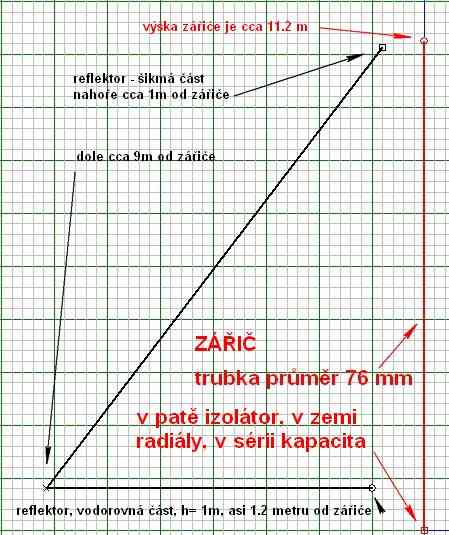 Myslím, že takové monstrum pro pásmo 80 metrů kdysi zrealizoval EU1TT ... Závěr 1. Na popsanou anténu mě přivedla myšlenka, když jsem experimentoval s vlajkovými stožárky a jejich hezkým příslušenstvím na připevňování vlajek. Protože je vyzařovaný svazek dvouprvkové antény dost široký, stačí na zahradě realizovat jen několik bodů na kotvení reflektoru. A také jsem zjistil, že lze jednoduše reflektor "srulovat", když ho není třeba, jen přepnout kondenzátor v patě a jsme QRV s jednoprvkovým vertikálem, který má sice menší zisk, ale nízký elevační úhel (asi 19°- 20°) a perfektní všesměrovou charakteristiku.