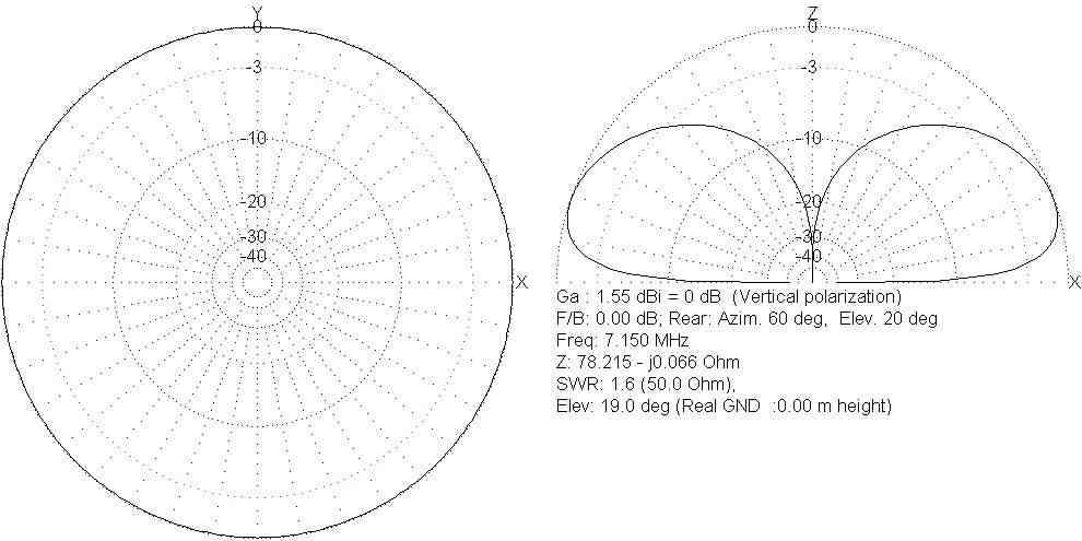 skutečnosti: S ohledem na uvedené dvě charakteristické vlastnosti šli konstruktéři mnohopásmových vertikálních antén také cestou jiných konstrukcí, než čtvrtvlnných antén. Např. vynikající GAP Titan DX vychází z konstrukce asymetricky napájeného vertikálního dipólu. Jiný výrobce volil u své vynikající antény (např. AV-640) rovněž asymetricky napájenou anténu vyšší výšky, než je lambda/4. Důsledkem takového počínání mimo jiné je, že se zbaví rozměrných radiálů, tj. čtvrtvlnné radiály, které jsou schopné "pošahat" vyzařovací diagramy, jsou nahrazené malými protiváhami, s jejichž symetrií vůči zemi odpadnou starosti. Vzroste nám však impedance. Ale to je snadno řešitelné a konstruktéři AV 640 vám ukázali, že se nebojí feritů a rozumných transformačních poměrů. Takto koncipované vertikály, nejenže lze konstruovat jako vícepásmové, ale lze je instalovat např. do výšky od 3 do 6 metrů. V takových výškách mají již nízké vyzařovací úhly (18°-20°), vyzařují bez výrazných minim a proti montáži při zemi mají větší zisk (např. o 2 dB). Jenže vertikální antény delší než 1/4 vlnové délky jsou přeci jenom vysoké a jejich kotvení se doporučuje. Máme nějaké možnosti, jak snižovat vyzařovací úhel u antén montovaných při zemi? Jaké máme možnosti zvyšovat jejich zisk? Snižování vyzařovacího úhlu u vertikálu montovaného na zemi Jako nejjednodušší metoda se mi jeví v opatrném zvyšování výšky vertikálu. Musíme však kompenzovat jalovou složku. To jde snadno a nejjednodušší je použít kondenzátor v sérii se zářičem. Např. vertikál o výšce 0.275 x lambda vyzařuje hezky, pod úhlem 19° (pásmo 40m):