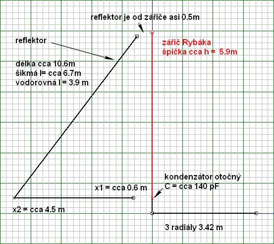 experimentu. Jednoduchý a praktický experiment s Rybákem Mnoho hamů si pořídilo anténku Rybakov. Chování víceprvkové vertikální antény na ní lze ověřit poměrně snadno. Potřebujeme prut dlouhý 7m, tenká měděná lanka, několik izolátorků a otočný kondenzátor. Ověření provedeme v pásmu 20 metrů. Zavrtáme do země vrut, který vylepšíme asi 3 radiály o délce kolem 3.4 metru tak, aby jeden radiál směřoval do požadovaného směru (např. VK) a zbývající dva byly na něho kolmé. Na laminátovém prutu je drátový zářič délky necelých 6m. Reflektor zhotovíme z tenkého Cu lanka (asi 10.6 m) a natáhneme ho v místě proti směru záření. Schéma je na obrázku a provozuje se to bez původního balunu. U paty teleskopu mi leželo asi 5 závitů koaxiálu RG58 na zemi, aby se mu nechtělo zářit a koaxiál odcházel k TRXu pod vodorovnou částí reflektoru: