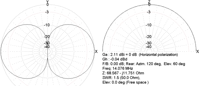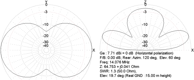 Vidíte, že můj dipól, který je z 20 mm trubek, je ve výšce 15 metrů, má geometrickou délku asi 10.2 metru má Z = 65 + j0.04 a tomu odpovídá VSWR cca 1.3. Tento dipól by ve volném prostoru zářil takto: