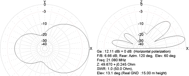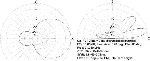 Můžete namítnout "ruku líbat". Zisk to má 12 dB, F/B je sice jenom 13 dB, VSWR = 1.8. Vždyť se do toho dá vysílat. Ano, dá. Podotýkám, že toto nastavení je pro danou konstrukci antény správné. Sice to nemá VSWR=1 a F/B=19 dB, jako u předchozího obrázku, je to jen o 6 dB horší na F/B a SWR je 1.8 a nikoliv SWR=1 ...Ham, který si tuto anténu postavil a investoval rovněž do anténního analyzátoru docílil následujícího nastavení.