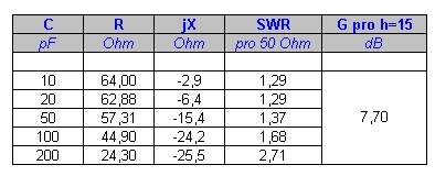 1:4. 2. Na otázku, zda parazitní kapacita ve středu zářiče vadí jiným anténám odpovím několika případovými studiemi. V následující tabulce vám ukážu, že u dipólu, který je v 15 metrech nad zemí se jeho zisk nezmění. Jinak je to s přizpůsobením. Nejdřív tabulka, kde jsou uvedené kapacity držáku v pF, hodnoty imepdance v místě napájení, VSWR pro přizpůsobení ke koaxiálu 50 Ohm a zisk dipólu. tabulka č. 1 Takže, pokud jste někdy měli u dipólu blbé SWR, může to být kapacitou uchycovací armatury ve středu. Vyzařovat by to však mělo vždy takto: