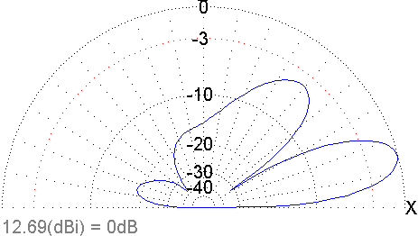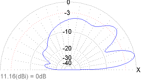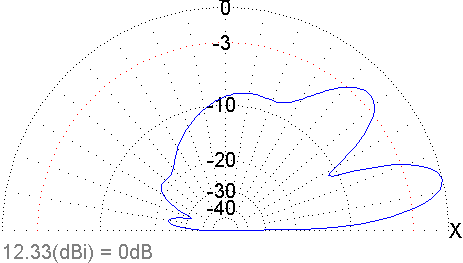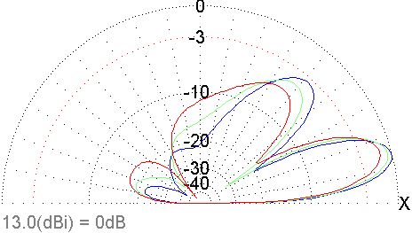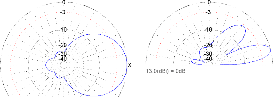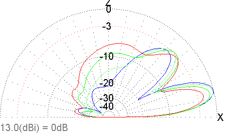 Diagram je vypočten pro kmitočet 14.076 MHz a anténa byla optimalizována na nejlepší F/B při zachování rezonance na uvedeném kmitočtu pro impedanci na svorkách Z = 25 + j0
