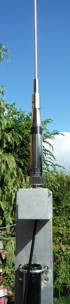5/8 lambda. Fázování je realizováno indukčností uprostřed zářiče.
