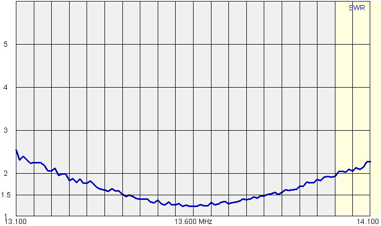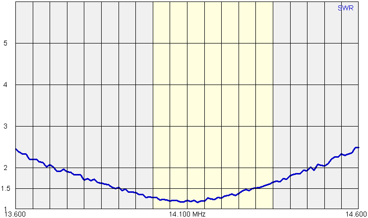 U antény jsem uvedl výhrady (koaxiál, zdá se mi příliš tlustý a težký) i přednosti - je to na konci napájená anténa, která je docela dobře přizpůsobená koaxiálnímu napáječi a její napájení je technicky čisté. Průběh VSWR u skutečné antény před zkrácením jsem uvedl (předchozí obrázek). Průběh VSWR u antény modelované v EZNEC demo (19 segmentů, model precizní země, vodivost 0.005, dielektrická konstanta 13, metoda NEC-2) pro geometrické rozměry stejné jako u reálné antény uvádím zde:
