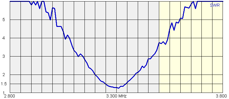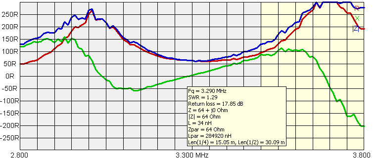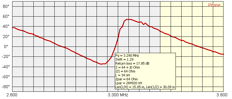 1) Vyrobené prototypy pro pásmo 80 metrů mě svými výsledky nenadchly. Anténa vyzařuje jako na konci napájený dipól, pouze pokud jsou oba konce v dostatečné výšce. Pokud byl tento konec jen ve 2m, byla kapacita koaxiálu proti zemi tak vysoká, že příliš neodpovídalo naladění do rezonance geometrickým rozměrům antény. Naladit však anténa šla. Aby byla rezerva na ladění, použil jsem výrobní délku poloviny zářiče (RG58) přesně 20 metrů, měřeno podle značek na koaxiálu. Kvůli hmotnosti jsem vyrobil druhou polovinu zářiče z anténního lana. Použitá délka lana byla přesně 22.5 m s rezervou na dostříhání. Při montáži jako sloper, s napájeným koncem ve výšce necelé 2 metry antény rezonovaly kolem 3300 kHz. Průběhy fáze, impedancí a VSWR vypadají před zkrácením typicky takto: