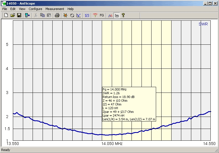 Konstrukci měřené antény popisuji níže. Nejlepší změřený poměr stojatých vln (VSWR) byl cca VSWR = 1.26, tomu odpovídala Z=47 Ohmů. Průběh VSWR byl plochý a odpovídal použitým vodičům zářiče. Jedno rameno tvořil plášť koaxiálního kabelu typu RG-58, druhé tvořil jednožilový izolovaný vodič. Délka zářiče byla v bodě nejlepšího VSWR cca 0.42 x lambda.