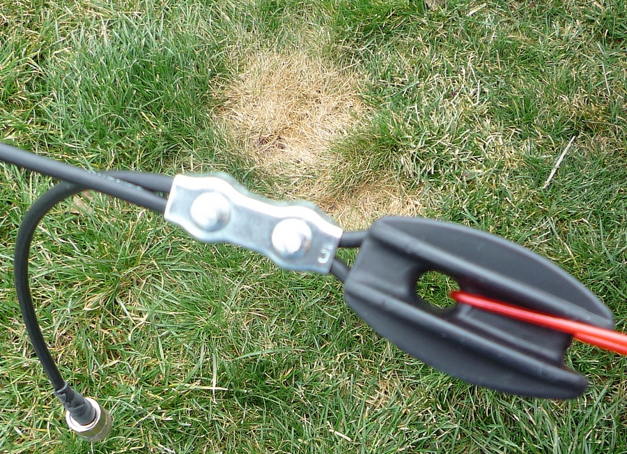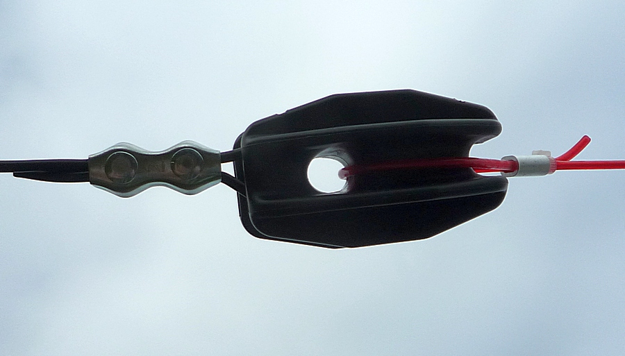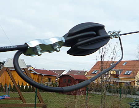 6. Anténu nainstalujeme za kotevní šňůry do pracovní výšky tak, abychom byli schopni konec s izolátorem spustit kvůli zkracování. U izolátoru je duplexní svorka, nesmíme zapomenout na to, že se musí povolit 2 šrouby, sejmout destička, upravit délka kabelu, vše namontovat zpět. Na stožáru či ve výškách se to dělá opravdu blbě, pamatujme tedy při instalaci na tuto potřebu.