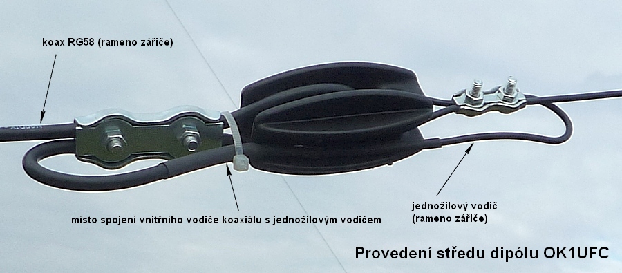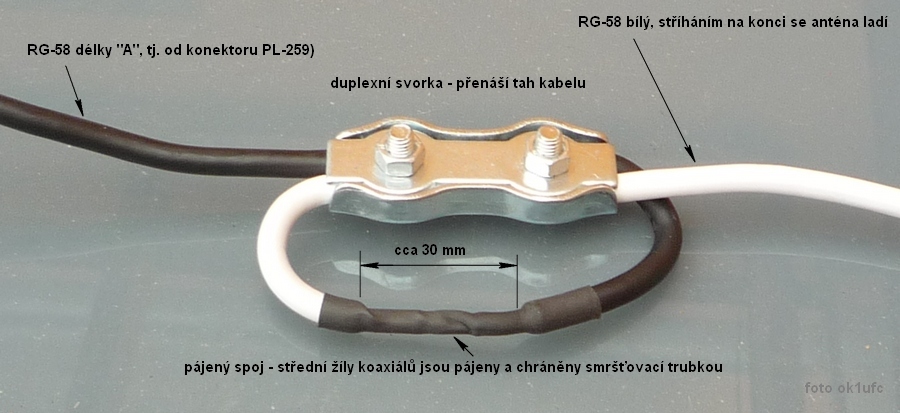 Do velkého vajíčkového izolátoru je provlečeno první rameno dipólu (vyrobené z RG-58), které napájí druhé rameno z jednožilového vodiče. Koaxiální kabel je zajištěn pomocí duplexní lanové svorky č. 5.