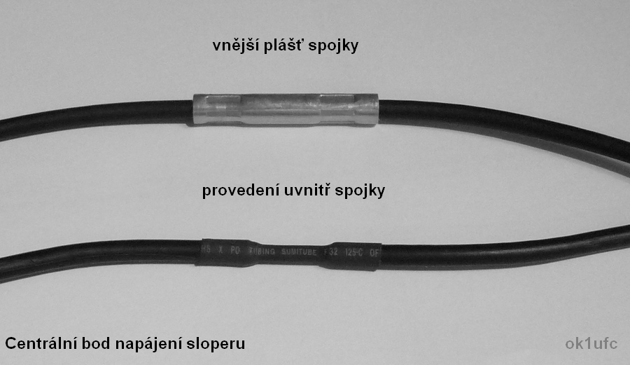 Vnitřní vodič koaxiálu je propojen s jednožilovým vodičem druhého ramene. Plášť koaxiálu není v tomto bodě s ničím propojen. Spojení vodičů je chráněnou smršťovací trubičkou.