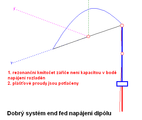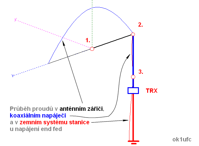 Poznámka: Uvědomme si dvě věci. Anténní zářič pracuje se stojatou vlnou. U END FED (na konci napájené) antény vždy pracuje se stojatou vlnou také plášť napáječe a celý zemní systém, vč. napájecích obvodů. A naměříme na něm minima a maxima proudů a napětí. Chceme-li mít dobrou anténu, musíme proudy tekoucí do zemního systému v maximální míře omezit.