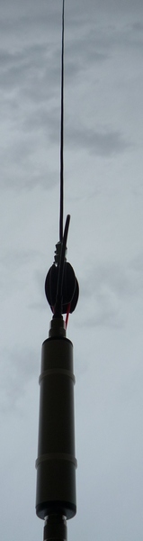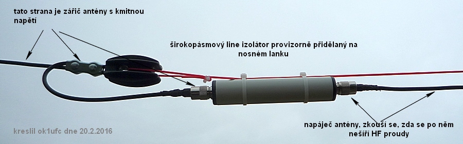 Přestože bylo větrno, tak jsem anténku zkoušel v praktickém provozu (SSB, pásmo 14 MHz). Zkoušená sestava byla upravena z výše popsané antény, která byla vystrojená pouze jediným širokopásmovým line izolátorem s vysokou impedancí. Line izolátor byl přichycen provizorně ke kotevnímu lanku pomocí stahovacích pásků.