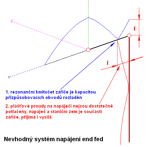 2. Plášťové proudy v napáječi jsou vysoké. Nejsou dostatečně potlačeny. Napáječ, staniční zem a napájecí obvody transceiveru (jsou typu PELV, tedy spojené s ochranným vodičem rozvodné sítě) se stávají součástí vyzařování systému. Anténa přijímá poměrně značnou úroveň hluku.