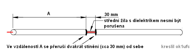 Poznámka: U dlouhých antén (pro pásma 80m a 40m) doporučuji vyrobit z koaxiálního kabelu jen část A a zbývající část zářiče vyrobit z anténního lanka (tak, jak je uvedeno v úvodní části článku). Podstatně se tím sníží hmotnost antény i její mechanické namáhání při námraze.