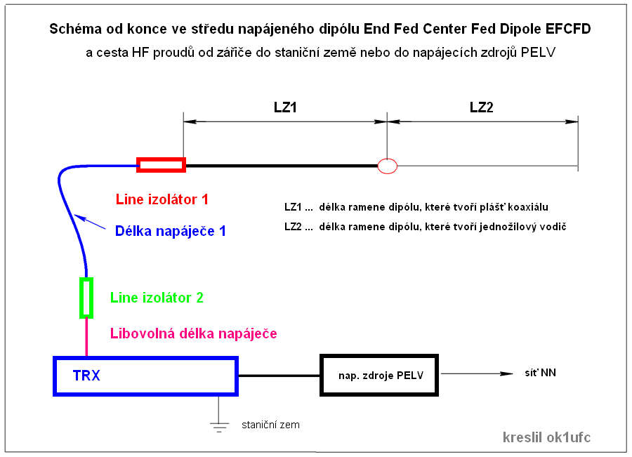 Skutečně se jedná o dipól, jehož zářič je (s ohledem na princip) napájen ve středu. Z hlediska konstrukce se jedná o anténu napájenou na konci (END FED). Proto ten krkolomný název End Fed Center Fed Dipole (EFCFD). Tím, že se jedná o dipól, který je napájený ve středu, odpadá nám starost s transformací impedancí. Impedance v místě napájení je nízká a je blízká nominální výstupní impedanci TRXu.