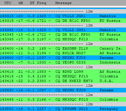Před pár minutama mi to nedalo a poslechl jsem na Hula Loop pásmo 24.9 MHz  a zachytil jsem obrazovku s dekódovanými stanicemi. Použitá anténa měla průměr 85 cm. Výška antény byla H = cca 5 m nad zemí, tj. na balkón v 1. np, fofografický stativ, zesilovač RA0SMS. Nejsilnější stanicí byla RD9D (+21 dB), notch filtr nebyl zapnutý. Nejslabší stanicí, podotýkám, že již mimo směr vyzařování K6EID, požadovaný směr byl nastaven na Jižní Ameriku.