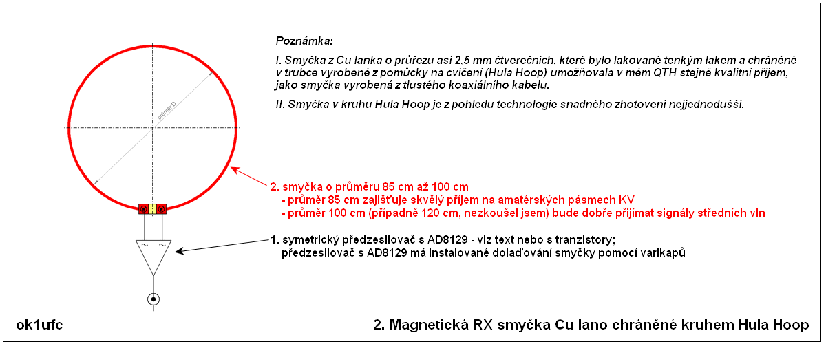 č. 2: Anténu v tomto provedení nazývám Hula Loop. Tato anténa používala zářič vyrobený z jemného Cu lana o průřezu asi 2.5 mm2. Použil jsem zbytky tence smaltovaného vodiče Rupalit od firmy Rudolf Pack GmbH & Co. KG, Am Bäuweg 9-11, D-51645 Gummersbach. Vodiče byly lesklé, smaltované velice tenkou vrstvou laku, která umožňovala snadné pájení. Lano bylo chráněné krytem z rozříznutého kruhu na cvičení (který bývá označován jako Hula Hoop, proto označení anrény Hula Loop). Zkoušel jsem antény s průměry cca 85 cm a cca 101 cm. Smyčka 85 cm mi vyhovovala pro všechna pásma KV, větší smyčka přijímala dost dobře od středních vln.
