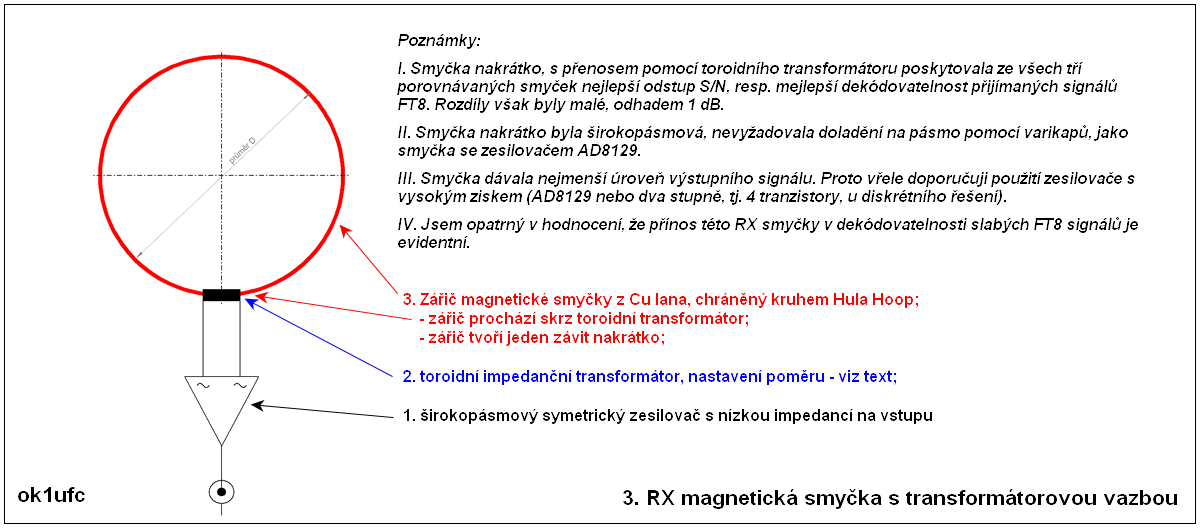Lepších výsledků jsem dosahoval s předzesilovačem podle RA0SMS, který jsem popsal (včetně odkazů a fotografie) zde. Smyčková RX anténa velikosti 85 cm je fakt dobrá. Dolaďování na vstupu zesilovače AD8129 je příjemné a nepříliš ostré. Rovněž netvrdím, že použitý zesilovač se vyznačuje nízkou vstupní impedancí, srovnatelnou např. s provedením LZ1AQ. Dosažená dekódovatelnost FT8 a odstup S/N však byly však srovnatelné, rozhodně ne horší, než u antény č. 1 zhotovené z koaxiálu. Prvně jsem zapochyboval, zda parametr vyššího potlačení elektrické složky pole je důležitý.