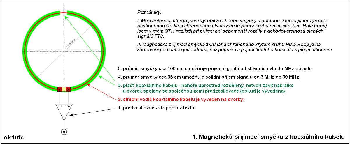 č. 1: Anténa vyrobená podle obrázku č. 1 mě potrápila při jejím zhotovení. Sehnal jsem si zbytek jakéhosi telekomunikačního kabelu, jehož stínění tvořila Cu trubka, dielektrikum polyetylén a vnitřní vodič Cu drát. Mechanická práce s takovým kabelem nebyla jednoduchá, pájení měděných částí téměř nemožné, a to i s použitím vysokých výkonů pájedel. Kabel navíc v místě horního přerušení pláště ztratil tuhost, kterou získal až připevněním plastové bandáže a ochrany proti zatékání vody. Bohužel, s anténou v tomto provedení jsem nenaměřil lepší dekódovatelnost signálů FT8 ve srovnání s dalšími porovnávanými smyčkami.