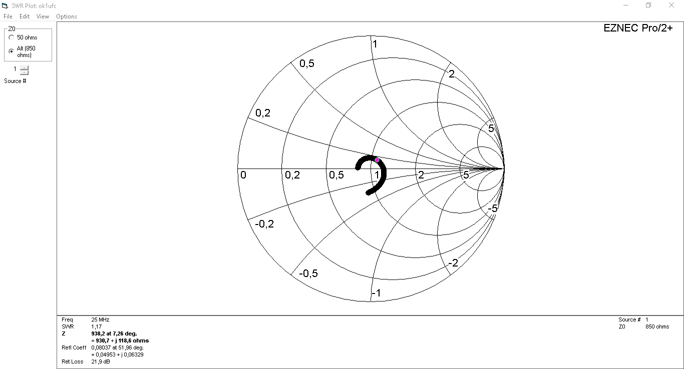 průběh impedancí (Smithův diagram) od cca 1 MHz do 70 MHz, případně