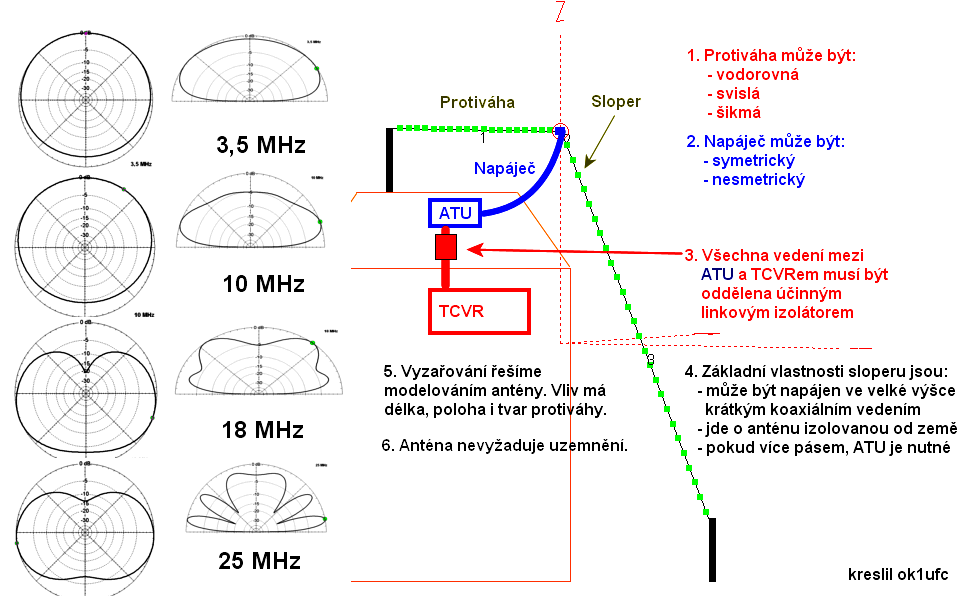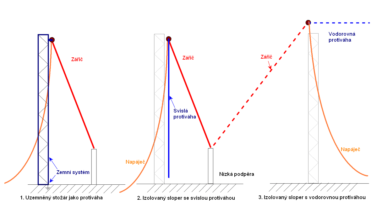 - sloper lze zkonstruovat jako anténu s jednou vysokou podpěrou,