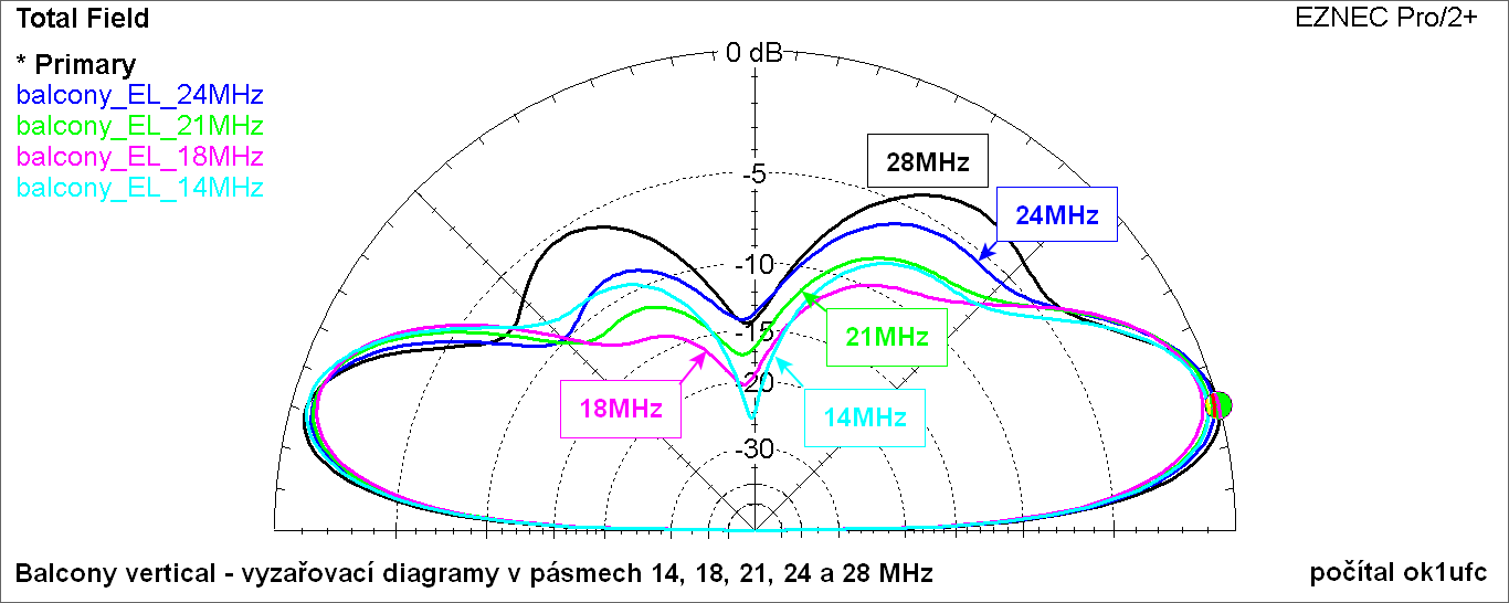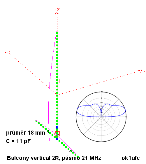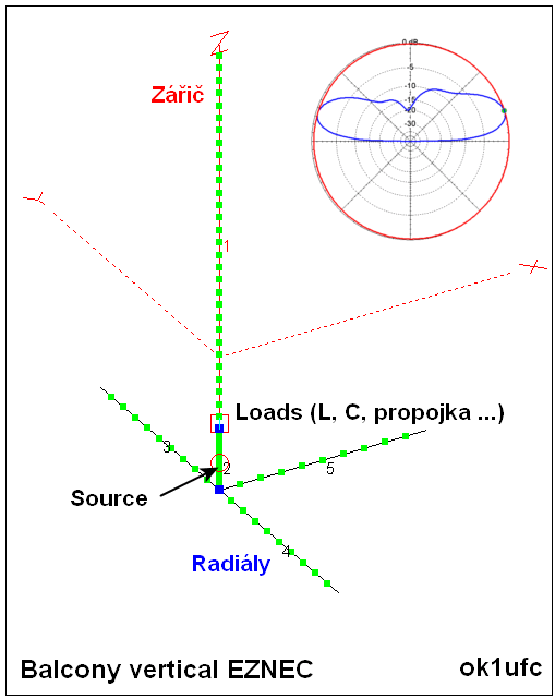 na jednoduchém modelu EZNEC modifikaci antény Balcony Vertical v