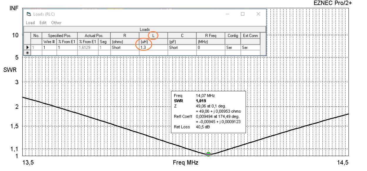 Na pásmu 14 MHz již vychází impedance vysoká (80 Ohmů). Aby se nám vrátila k hodnotě