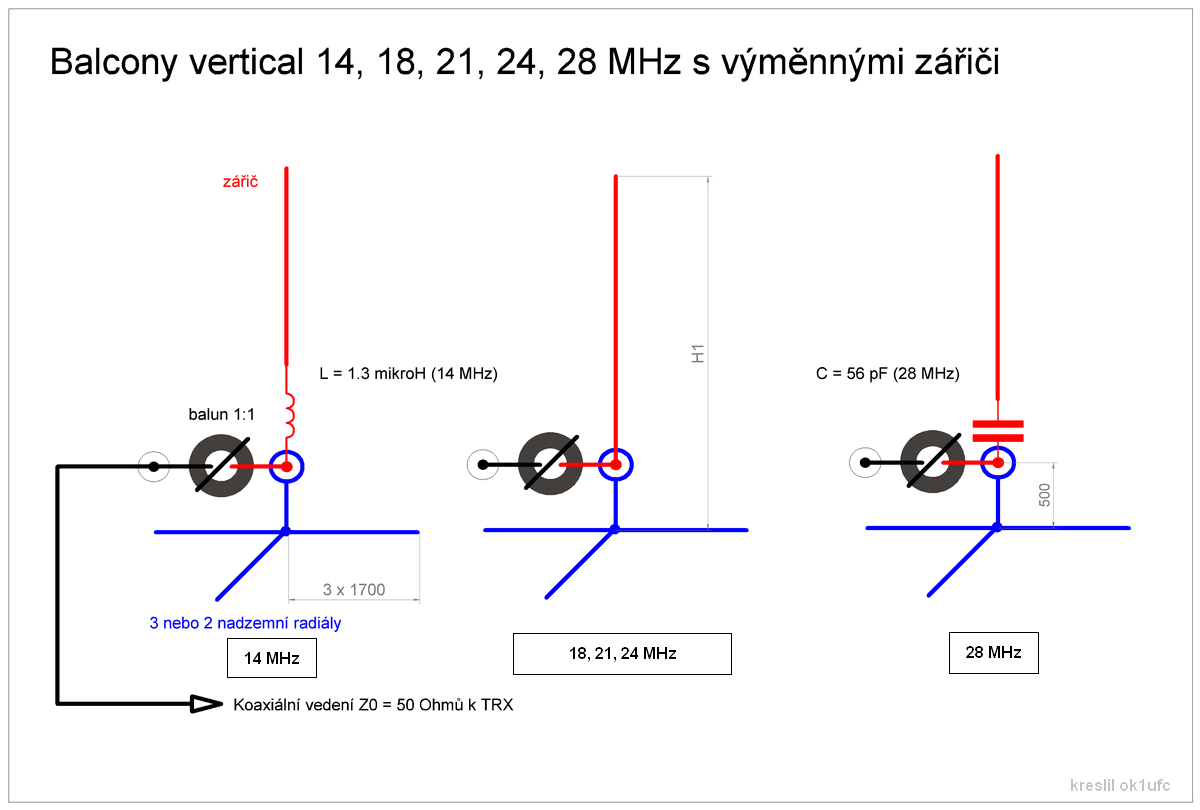 vertikál - výměnné zářiče pro 14, 18, 21, 24 a 28 MHz |