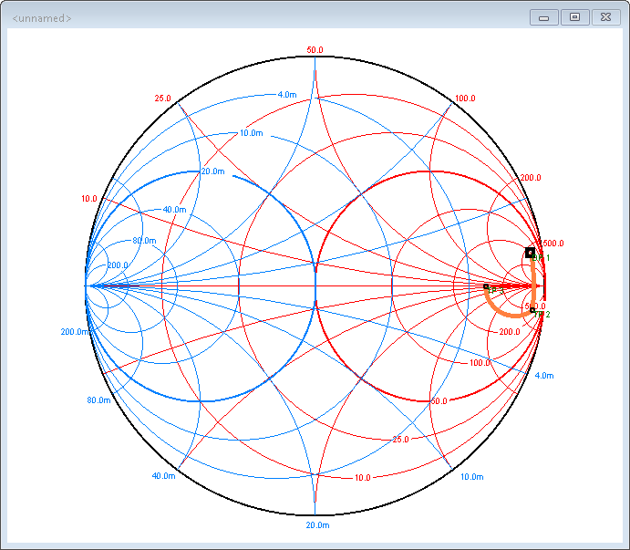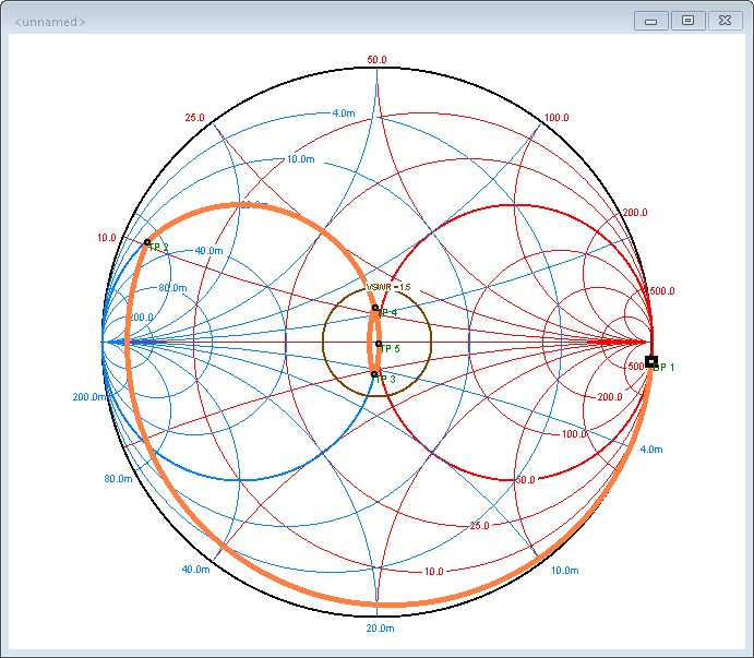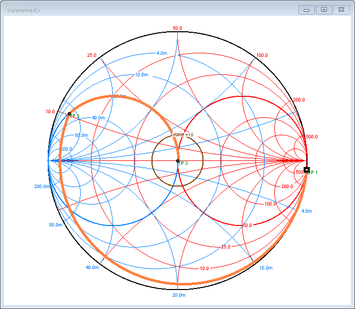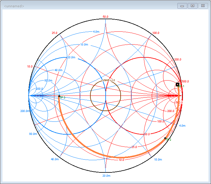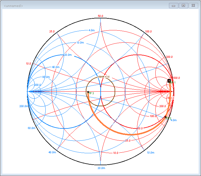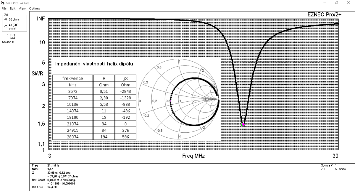 s těmito hodnotami impedancí na svorkách (Diagram průběhu VSWR s uvedením