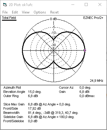 rozpětí je cca 80% proti půlvlnnému dipólu (např. rozpětí 6m pro pásmo 21