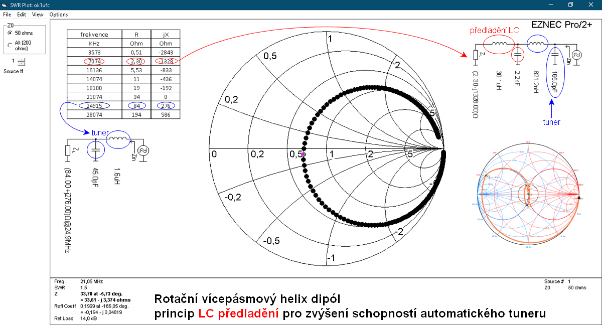 předladění uvádím na obrázku se Smithovým diagramem (dvě typická pásma):