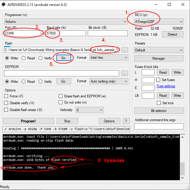 kompilátoru nahrajeme do procesoru pomocí programu AVRDUDESS (je